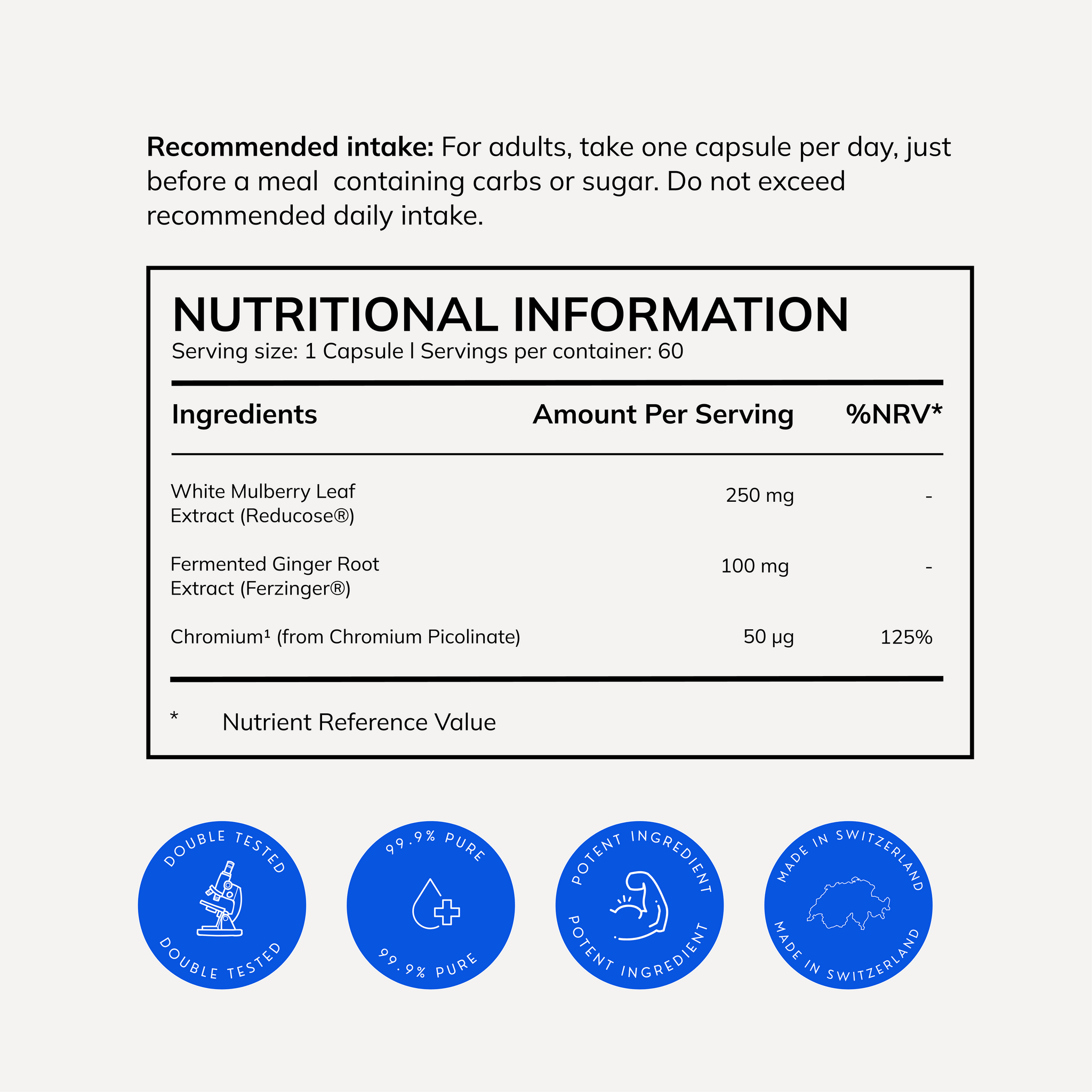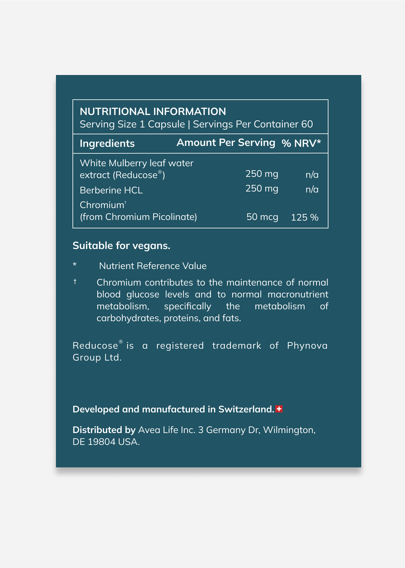 The formula combines the best ingredients from nature: the patented white mulberry leaf extract Reducose®, the innovative fermented ginger extract Ferzinger™ and the essential trace element chromium in its bioavailable form chromium picolinate.