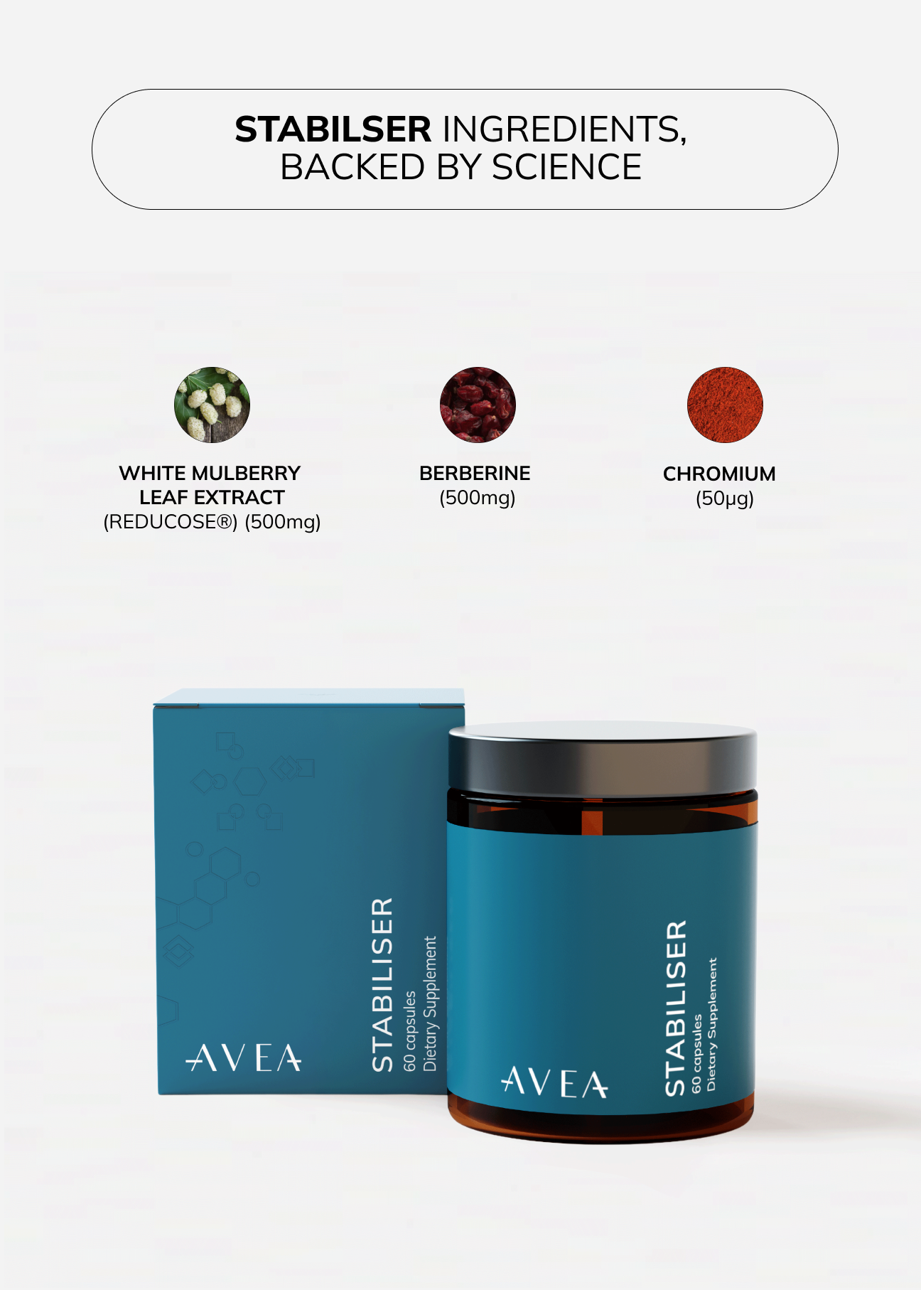 The Stabiliser contains Reducose®, a clinically studied white mulberry leaf extract. Reducose® can contribute to maintaining the body's carbohydrate metabolism balance.*