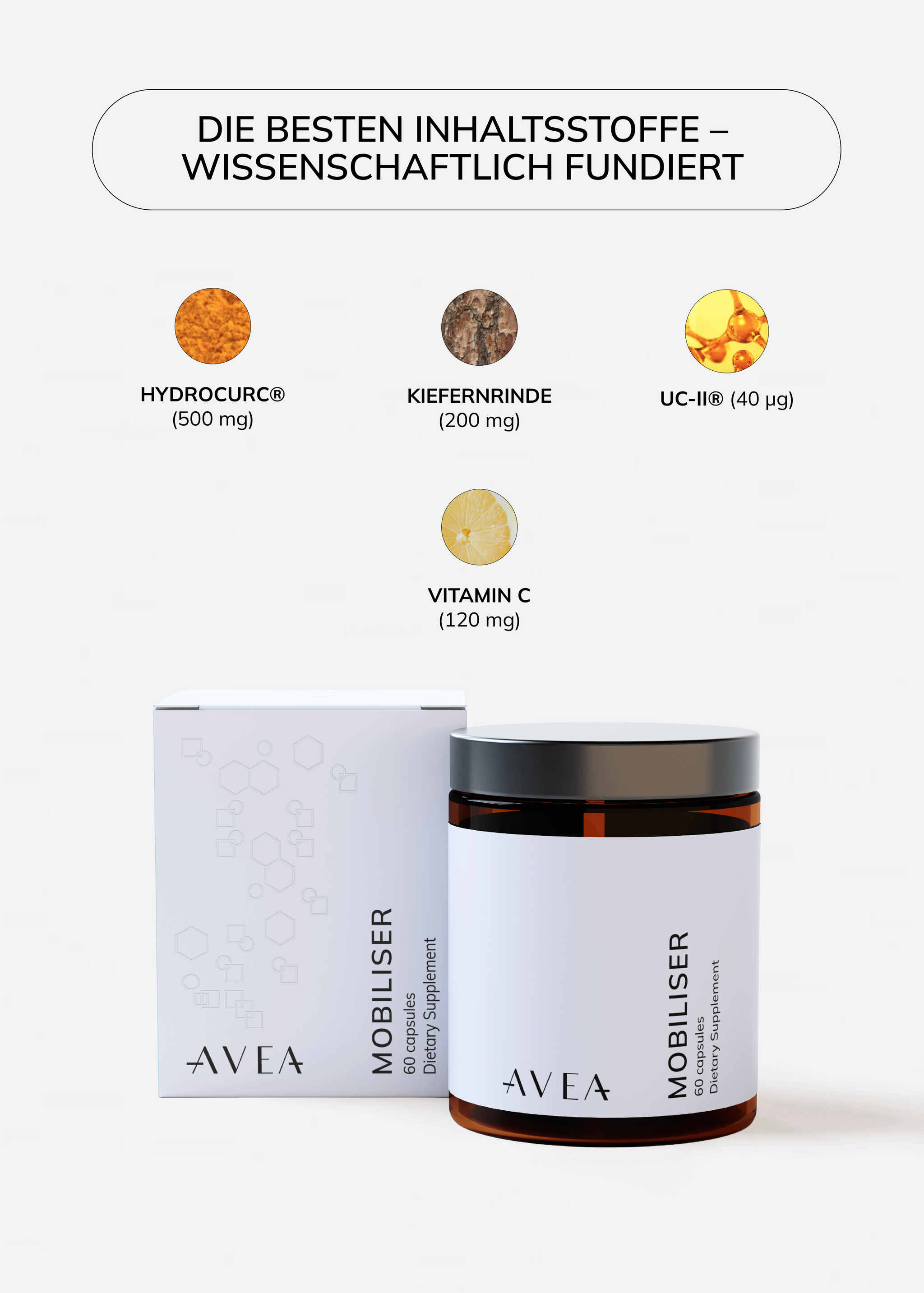Der Mobiliser vereint sorgfältig ausgewählte Inhaltsstoffe: Curcumin (HydroCurc®), ein seit Jahrhunderten geschätzter Pflanzenextrakt, sorgt für Balance und Vitalität. Ergänzt wird die Formel durch maritime Kiefernrinde, die mit ihrer besonderen Zusammensetzung in hochwertigen Formulierungen geschätzt wird. Vitamin C trägt zudem zu einer normalen Kollagenbildung für die Knorpelfunktion bei und unterstützt den Schutz der Zellen vor oxidativem Stress.
