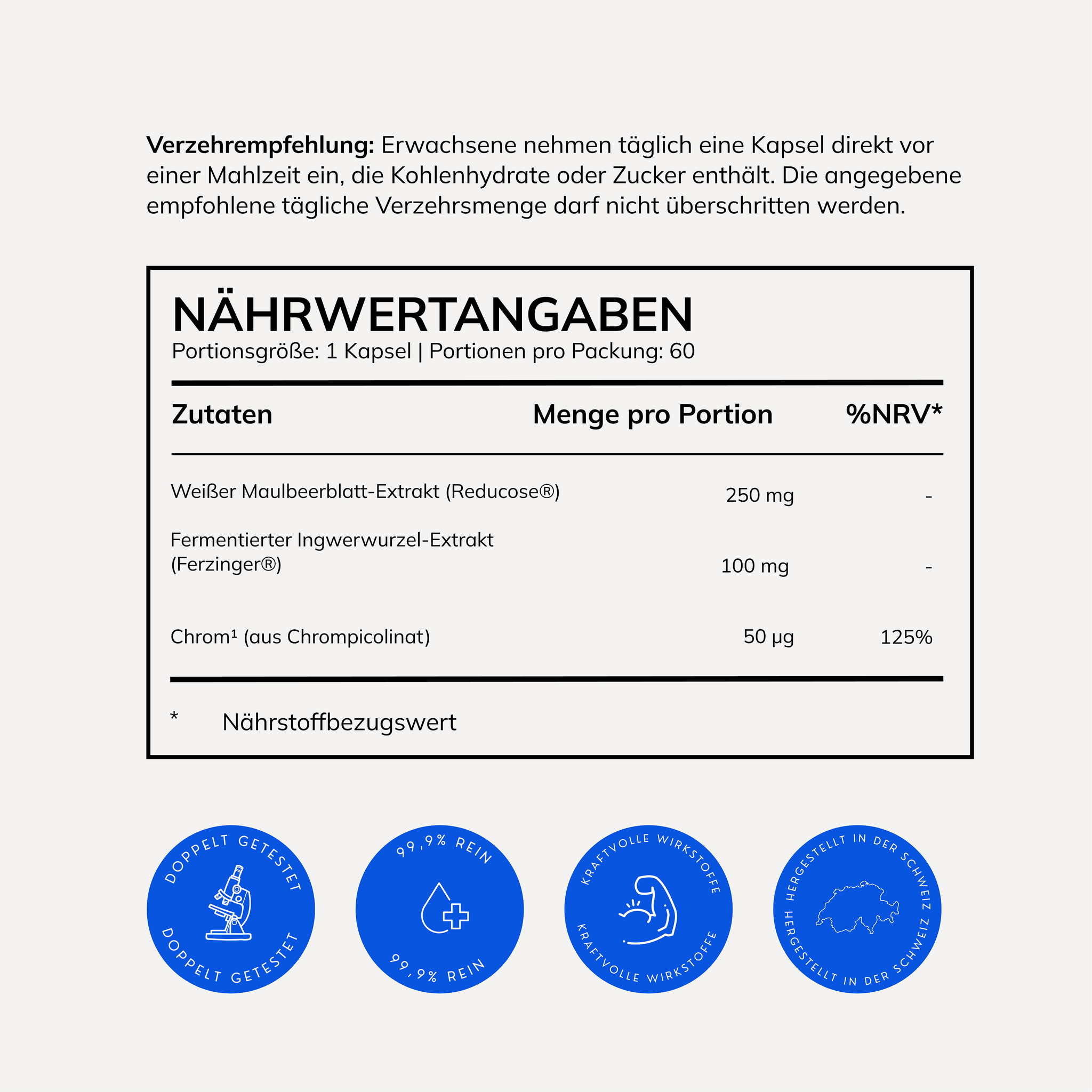 Zutaten: Extrakt aus weißen Maulbeerblättern (Reducose®), Füllstoff (mikrokristalline Cellulose), Überzugmittel (Hydroxypropylmethylcellulose), fermentierter Ingwerwurzel-Extrakt (Ferzinger®), Stabilisator (Isomalt), Trennmittel (Magnesiumsalze der Speisefettsäuren), Chrompicolinat.